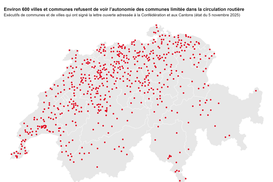 Plusieurs centaines de villes et de communes demandent expressément à la Confédération et aux cantons de respecter le partage des tâches entre les échelons de l’État et de ne pas restreindre davantage la marge d’appréciation et de manœuvre des communes en matière de mesures de circulation. Environ 600 exécutifs de communes et de villes de la Suisse entière et de toute appartenance politique ont signé une lettre ouverte sur ce sujet. Ils se réfèrent à la proposition de mise en œuvre du Conseil fédéral sur la motion 21.4516 «Consolider la hiérarchie du réseau routier à l’intérieur comme à l’extérieur des localités». La motion vise à rendre plus difficile la mise en œuvre de limitations de vitesse à 30 km/h sur ce que l’on appelle les routes «affectées à la circulation générale». Des initiatives similaires ont été déposées dans plusieurs cantons.